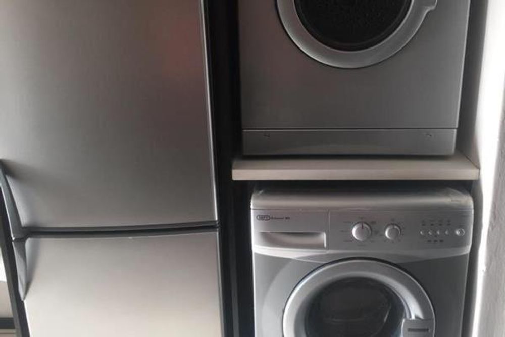 As you enter, you'll be greeted by an open-plan kitchen that seamlessly flows into the lounge area. This spacious and airy environment is ideal for both relaxation and entertaining. The kitchen is fully equipped with high-quality appliances, including a fridge, washing machine, and tumble dryer, ensuring that convenience is always at your fingertips.