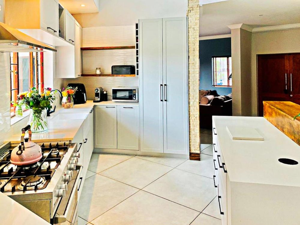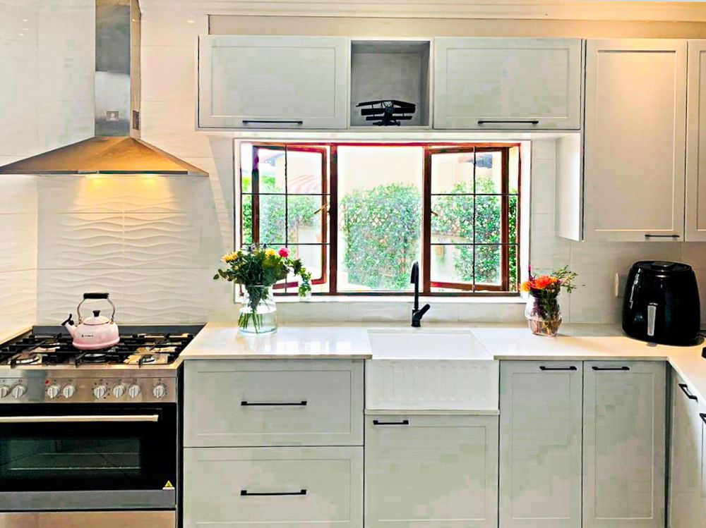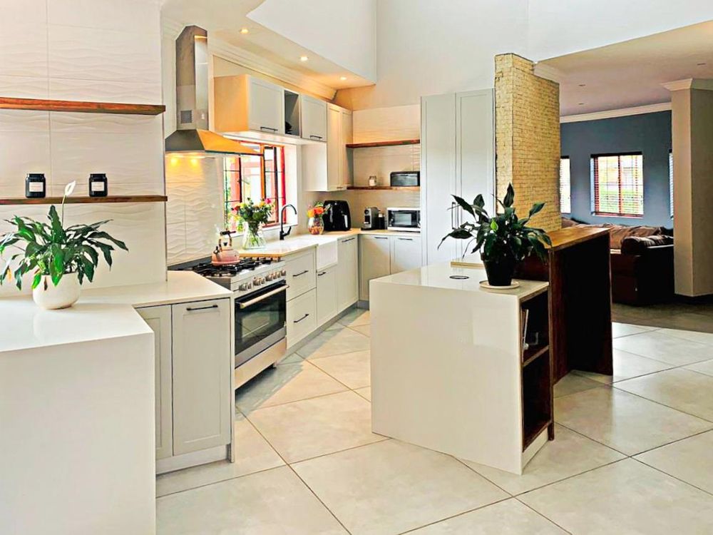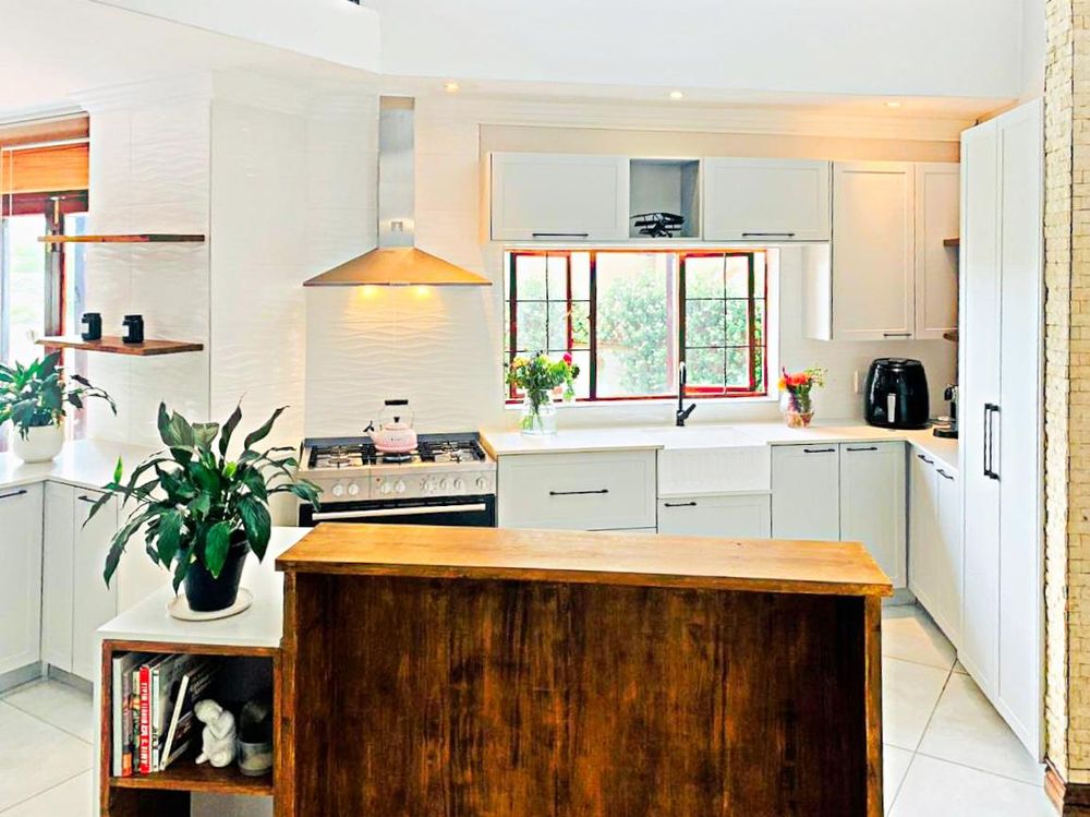 Beautiful modernised kitchen with island, pantry and space for a double fridge. 5 Burner gas stove with an electric oven. Butler sink.