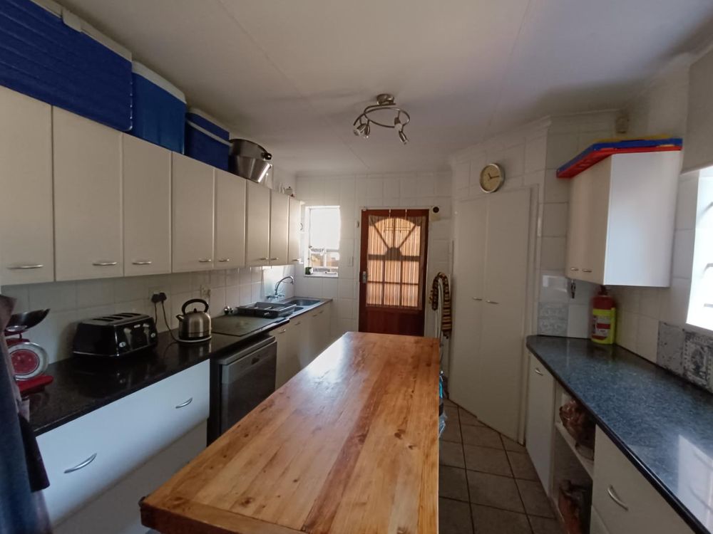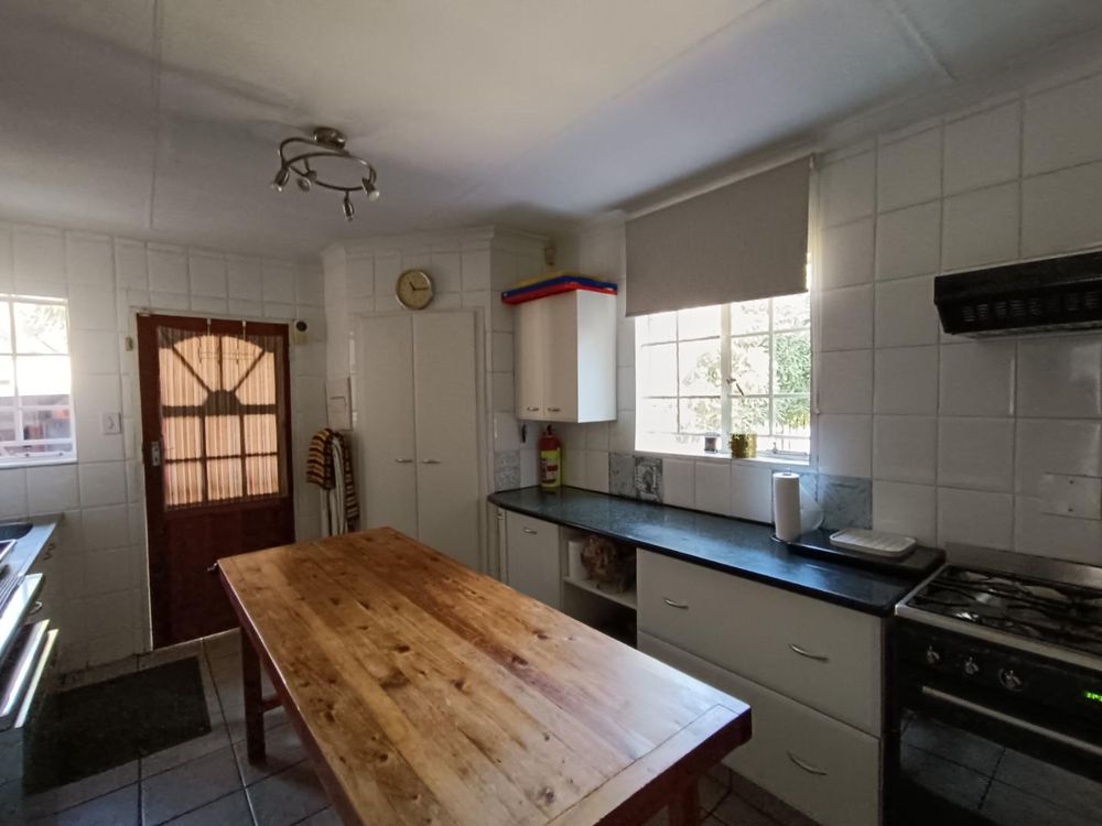 * Kitchen with a large gas stove, space for a double fridge, ample counter working space, and 2 pantry cupboards.
