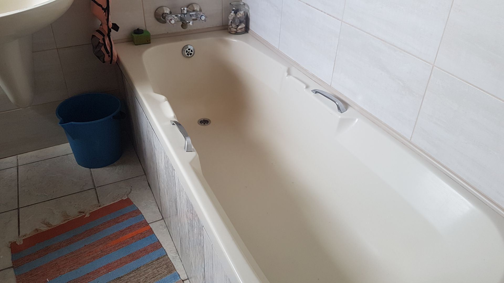 Two bedrooms with build-in cupboards and a bathroom with a bath and shower. Space for a washing machine.